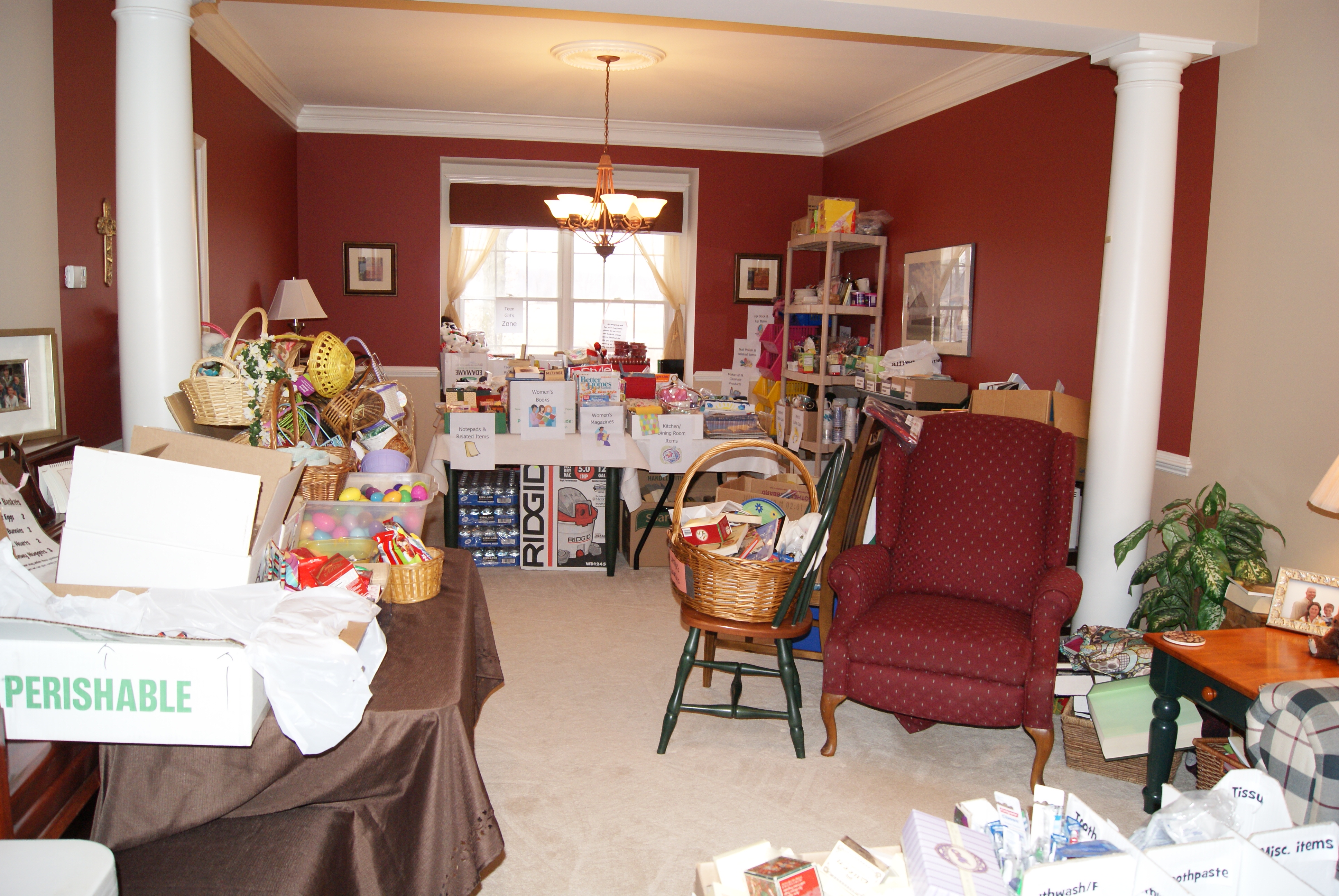 Altogether we assembled over 1,700 kid baskets and close to 500 adult baskets.  While exciting, it is also humbling for we know that those numbers did not come by our strength.  Our house went from looking like this…