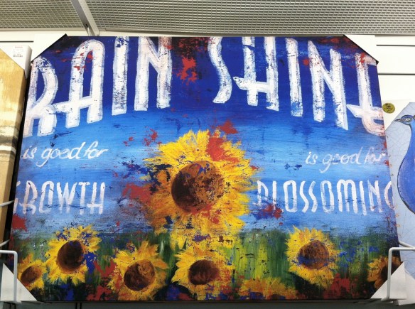 It was while shopping this last Friday that God helped me to sum up these days…many of the days have been hard tempered with days of sunshine.  As I stood admiring the blueness of this picture and the yellow sunflowers, I realized what the words were saying.“Rain is good for growth. Shine is good for blossoming.”  Well, isn’t that simply and beautifully true?  We really do need both to grow and blossom–to become all we are meant to be.  Rain and sunshine.  Good times and hard times.  Too much of either, while pleasant for the moment in some circumstances, throws us out of balance and can lead to our demise.  Not enough of either and we cannot grow or blossom.  Any gardener knows this to be true.
